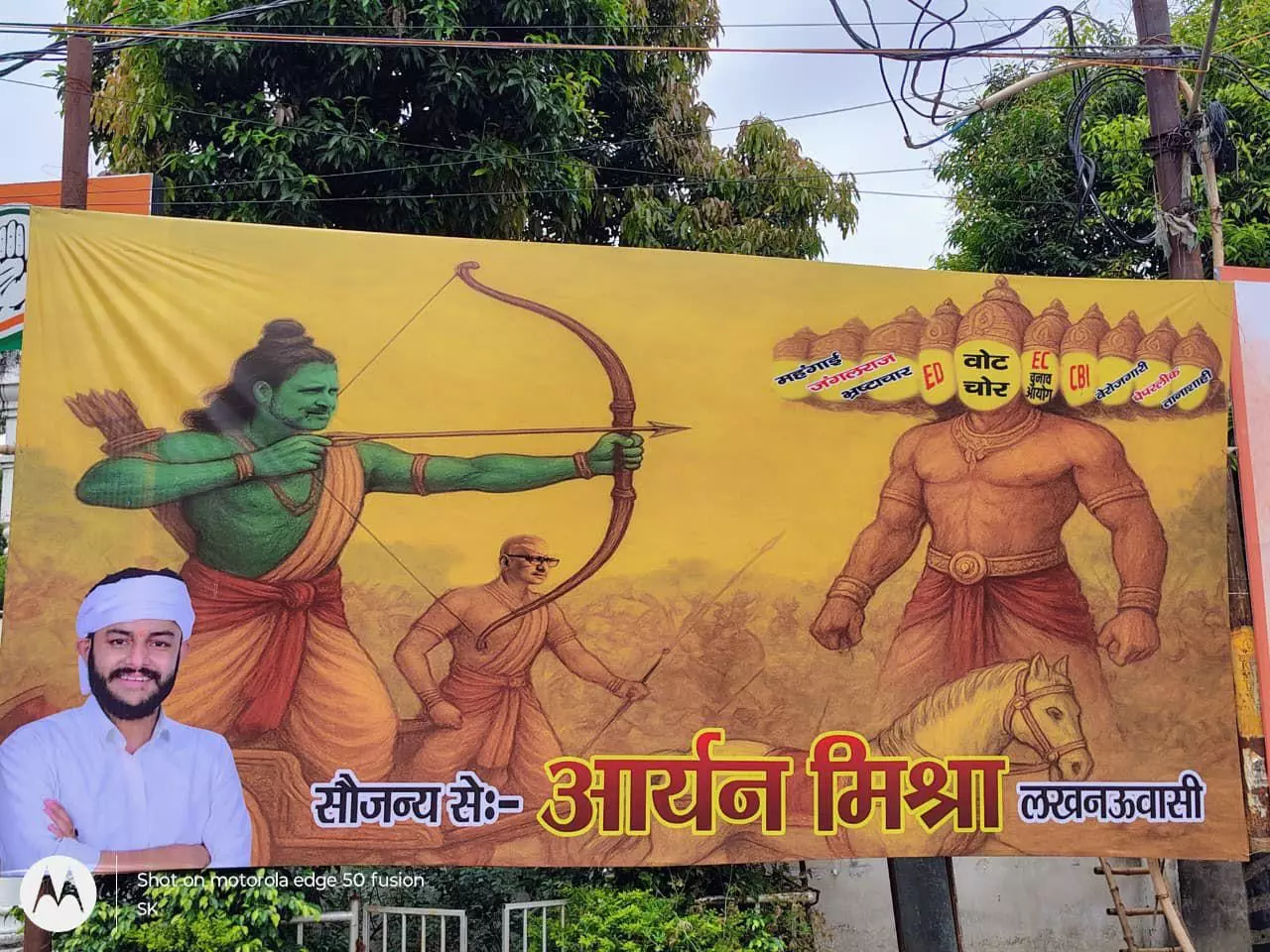 उत्तर प्रदेश की राजनीति में होर्डिंग से एक नया सियासी तूफान खड़ा हो रहा है। इस राजनीतिक-धार्मिक चित्रण वाले होर्डिंग को एनएसयूआई (NSUI) के प्रदेश उपाध्यक्ष आर्यन मिश्रा ने लगवाया है, जिनकी तस्वीर भी होर्डिंग पर प्रमुखता से दिख रही है। यह होर्डिंग पारंपरिक राम-रावण युद्ध को वर्तमान राजनीतिक और सामाजिक मुद्दों से जोड़ता है। रावण के दस सिर को वर्तमान सरकार पर लगाए गए दस प्रमुख आरोपों के तौर पर दर्शाया गया है। इसमें महंगाई, जंगलराज, भ्रष्टाचार, सीबीआई, ईडी, बेरोजगारी, पेपरलीक, तानाशाही और चुनाव आयोग जैसे मुद्दे शामिल हैं, जबकि रावण के मुख्य सिर को वोट चोर के रूप में दिखाया गया है।