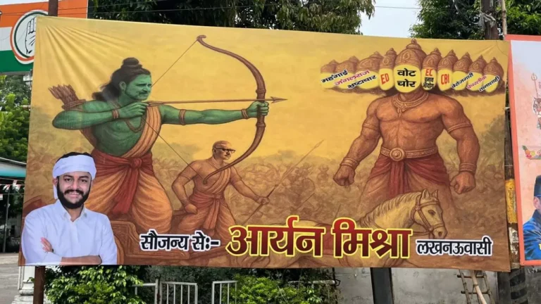 उत्तर प्रदेश की राजनीति में होर्डिंग से एक नया सियासी तूफान खड़ा हो रहा है। इस राजनीतिक-धार्मिक चित्रण वाले होर्डिंग को एनएसयूआई (NSUI) के प्रदेश उपाध्यक्ष आर्यन मिश्रा ने लगवाया है, जिनकी तस्वीर भी होर्डिंग पर प्रमुखता से दिख रही है। यह होर्डिंग पारंपरिक राम-रावण युद्ध को वर्तमान राजनीतिक और सामाजिक मुद्दों से जोड़ता है। रावण के दस सिर को वर्तमान सरकार पर लगाए गए दस प्रमुख आरोपों के तौर पर दर्शाया गया है। इसमें महंगाई, जंगलराज, भ्रष्टाचार, सीबीआई, ईडी, बेरोजगारी, पेपरलीक, तानाशाही और चुनाव आयोग जैसे मुद्दे शामिल हैं, जबकि रावण के मुख्य सिर को वोट चोर के रूप में दिखाया गया है।