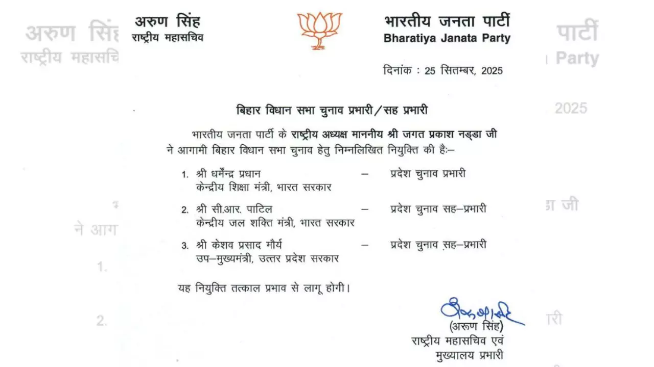 बीजेपी ने धर्मेंद्र प्रधान, सीआर पाटिल और केशव प्रसाद मौर्य जैसे नेताओं को मैदान में उतारकर संकेत दिया है कि इस बार बिहार चुनाव में पार्टी पूरी ताकत से उतरने जा रही है।
