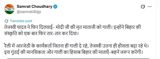 सम्राट चौधरी ने लिखा, “तेजस्वी यादव ने एक बार फिर मोदी जी की दिवंगत माताजी का अपमान किया है। उन्होंने बिहार की संस्कृति को तार-तार किया है। राजद की रैली में कार्यकर्ता गालियों की बौछार कर रहे थे और तेजस्वी उन्हें प्रोत्साहित कर रहे थे। बिहार की माताएं-बहनें इस गुंडागर्दी और गालीबाज़ी वाली मानसिकता का ज़रूर हिसाब लेंगी।”