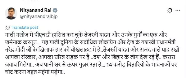 नित्यानंद राय ने कहा, “तेजस्वी यादव के गुंडों ने प्रधानमंत्री नरेंद्र मोदी और उनकी पूज्य मां का अपमान करके बहुत बड़ा पाप किया है। बार-बार पीएम मोदी और उनकी मां को गालियां देकर ये लोग अराजकता फैला रहे हैं। तेजस्वी, हम तुम्हें कंस की तरह नष्ट कर देंगे। बिहार की जनता वोट से तुम्हारा सफाया कर देगी। तुम कालिया नाग की तरह ज़हर उगल रहे हो।”